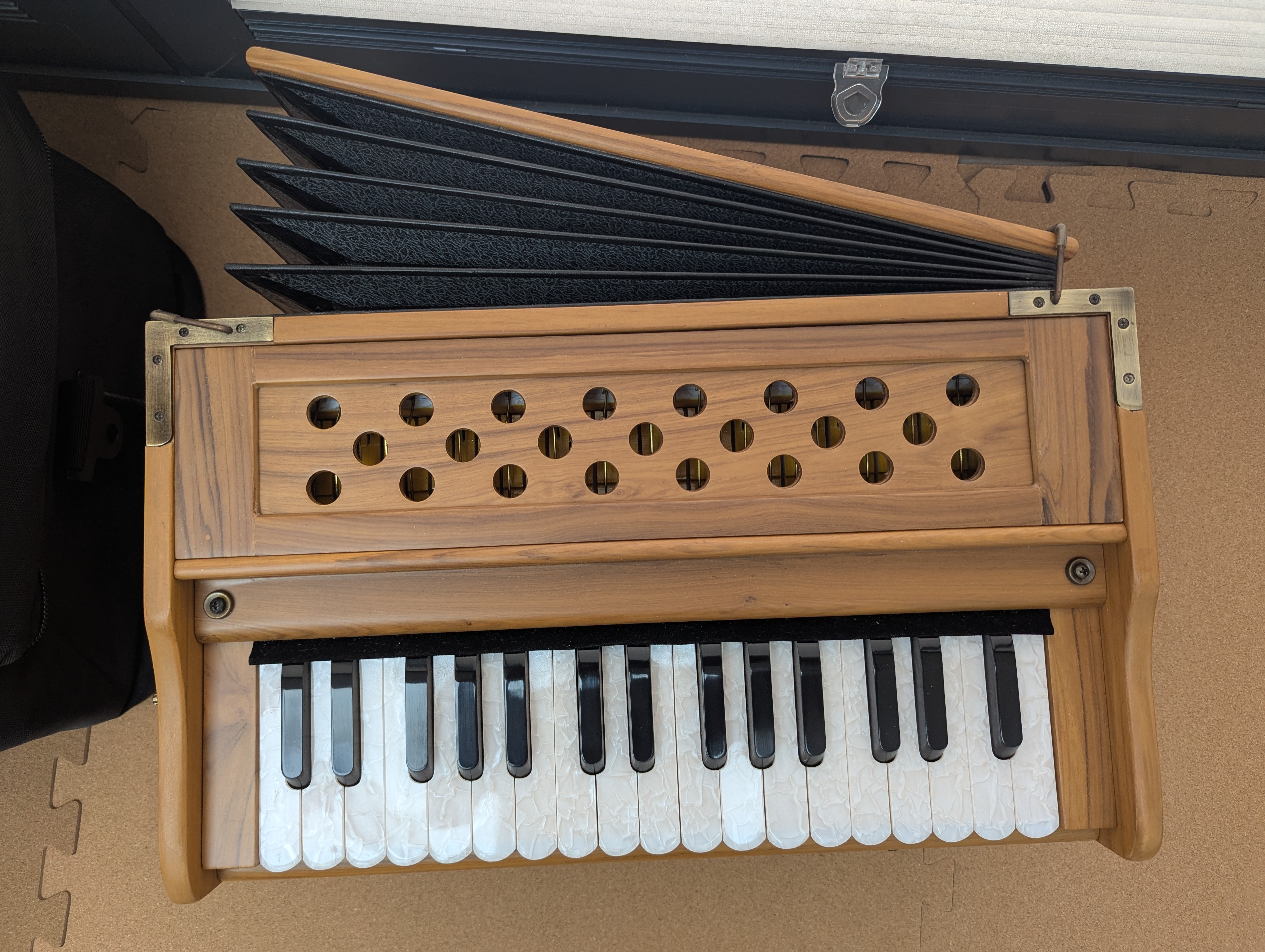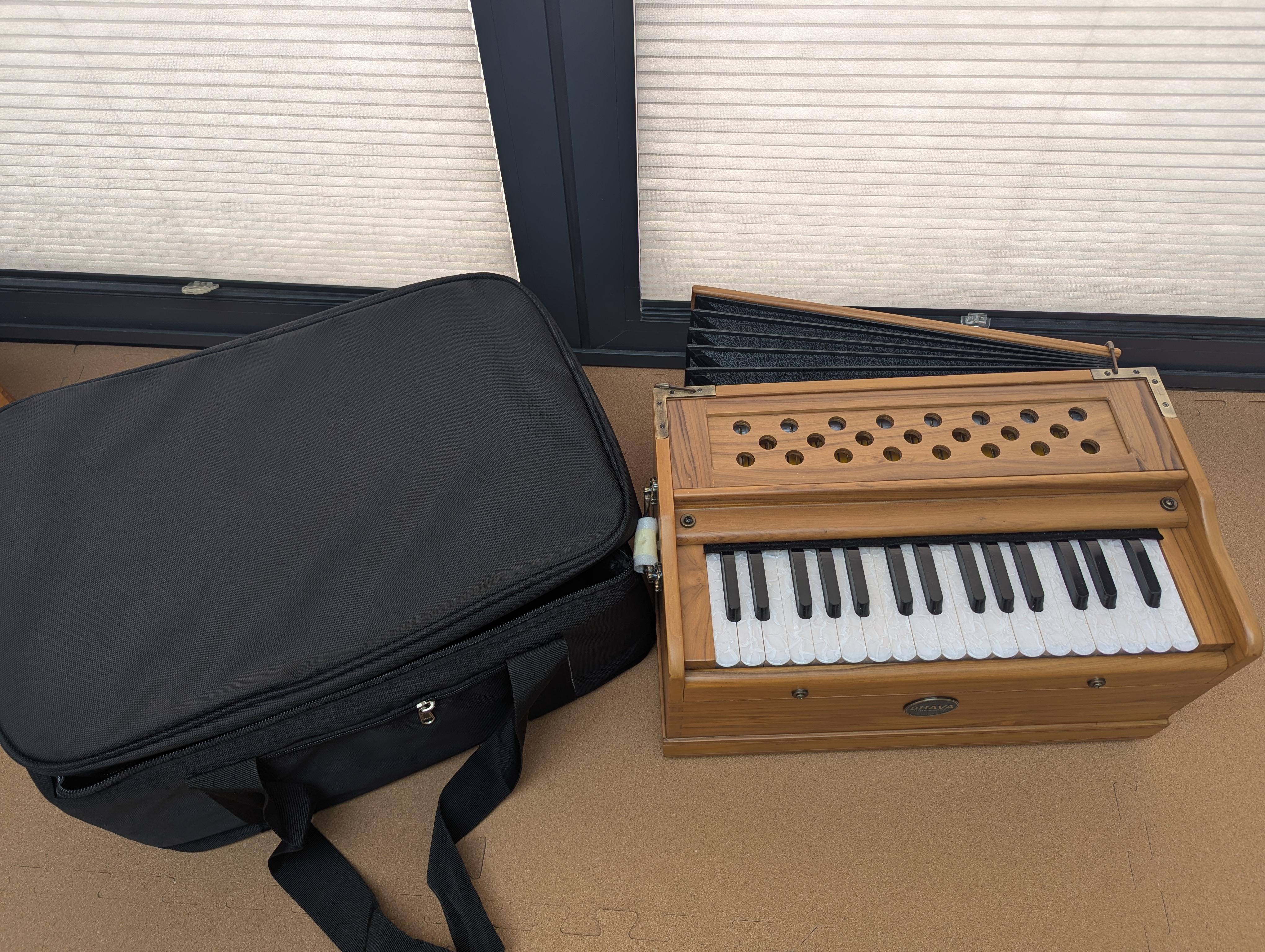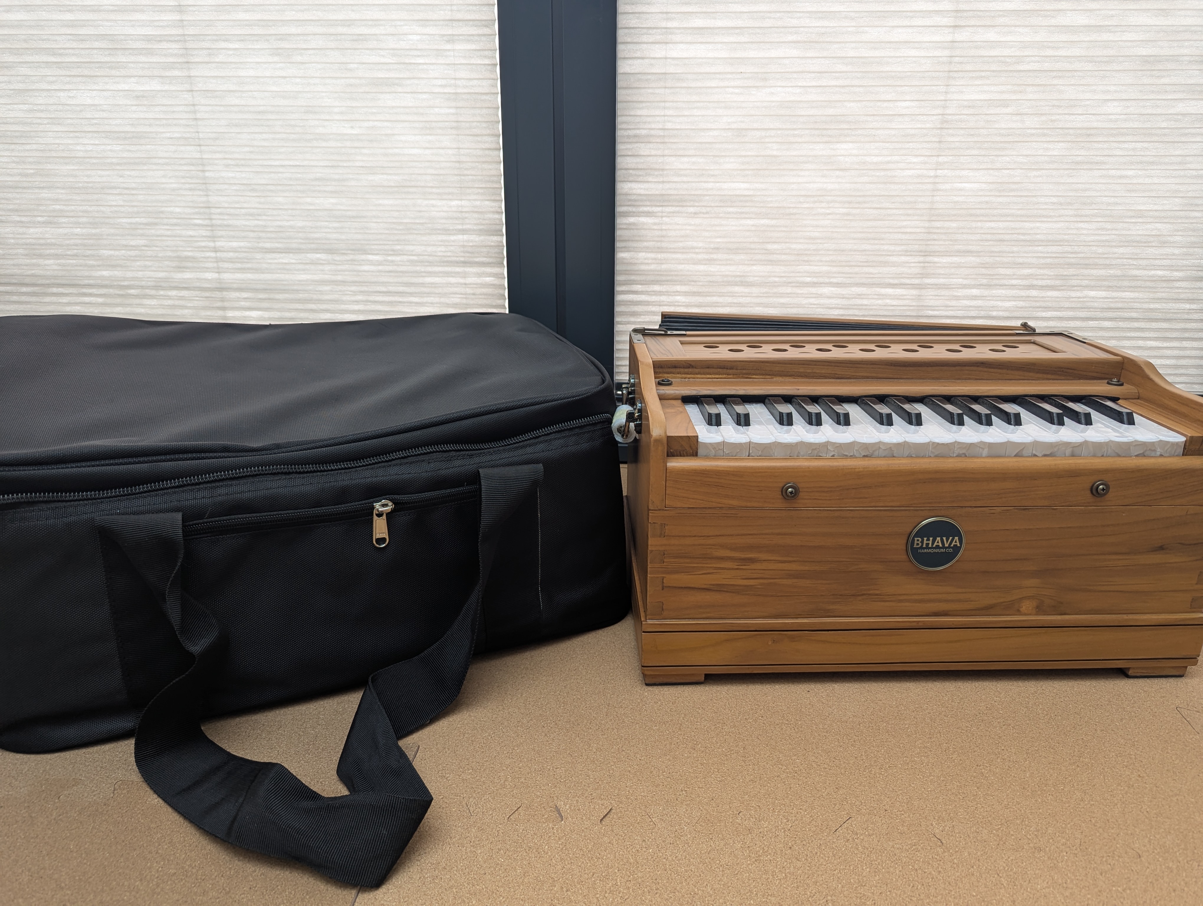 The Bhava Lite is a minimalist 32-key travel harmonium. Made to sound incredible and last a lifetime, this Concert Teak Edition is a true heirloom-quality build. This harmonium is simple, reliable, and a joy to play. Whether you are traveling across town or journeying overseas, this is a harmonium you will enjoy bringing along. Clear Tonality: Resonating through a solid teak shell. Dovetail Joints: An industry first for harmoniums and a long-time standard for quality cabinetry. Joined perfectly like a puzzle, this method eliminates the need for nails, allowing the wood to resonate without disruption. Timeless Fit and Finish: Beautiful antique brass hardware components and smooth, durable wood finish. *Wood color may vary slightly* This harmonium is simple, reliable, and a joy to play. Whether you are travelling across town or journeying overseas, this is a harmonium you will enjoy bringing along. Includes a padded gig bag The Harmonium can be collected in person from our Studio.About the Bhava Lite - Teak Concert Edition